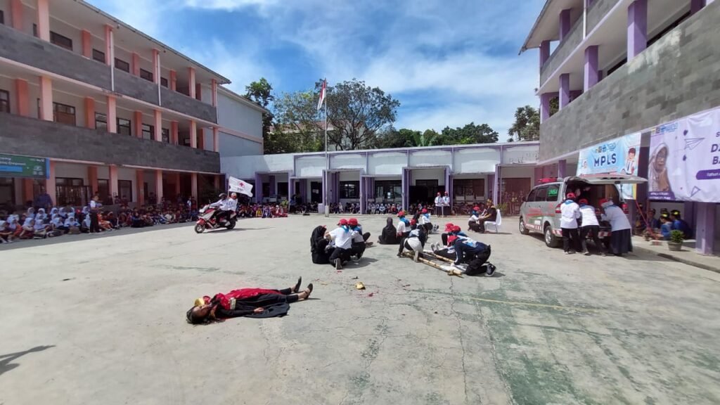 Yang paling menyita perhatian adalah ketika suara sirine menggema, mengiringi kedatangan motor dan mobil ambulans ke tengah lapangan sekolah. Aksi teatrikal ini bukan sekadar atraksi, melainkan bagian dari simulasi penanganan korban oleh tim PMR, lengkap dengan prosedur pertolongan pertama yang sesuai standar.